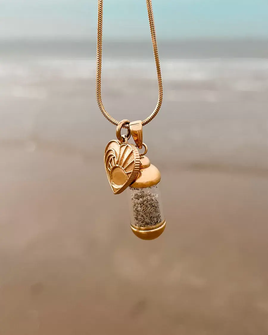 The ideal set for Ocean Lovers: the Laguna Beach Pendant Ocean Lover gold. Carry your favorite spot with you wherever you go. And with your personal Laguna Beach Pendant, filled with the sand of your favorite beach, you'll have a special, lasting memory of your most beautiful trip or greatest adventure.