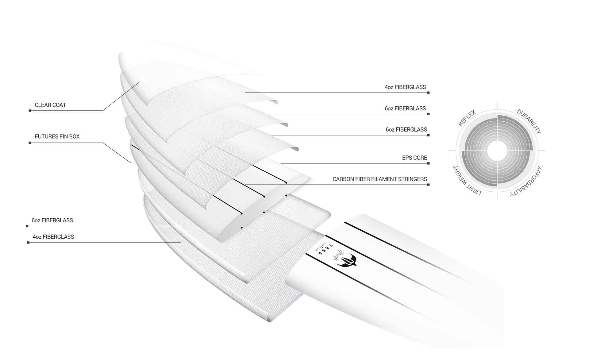 For lengths of 8'6 and over we have introduced a T-stringer and UD carbon triple strips on the deck and bottom for a new level of torsional strength. The Torq longboard technology is incredibly strong, light and responsive. With 3 layers of glass on the deck and 2 layers on the base, these are super strong, light and feel fast under your feet.