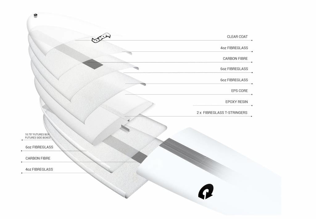 Für Längen ab 8'6 und größer wurde ein T-Stringer sowie UD-Carbon-Triple-Strips auf Deck und Unterseite integriert, um ein neues Level an Torsionssteifigkeit zu erreichen. Die Torq-Longboard-Technologie ist extrem stark, leicht und sehr reaktionsfreudig.