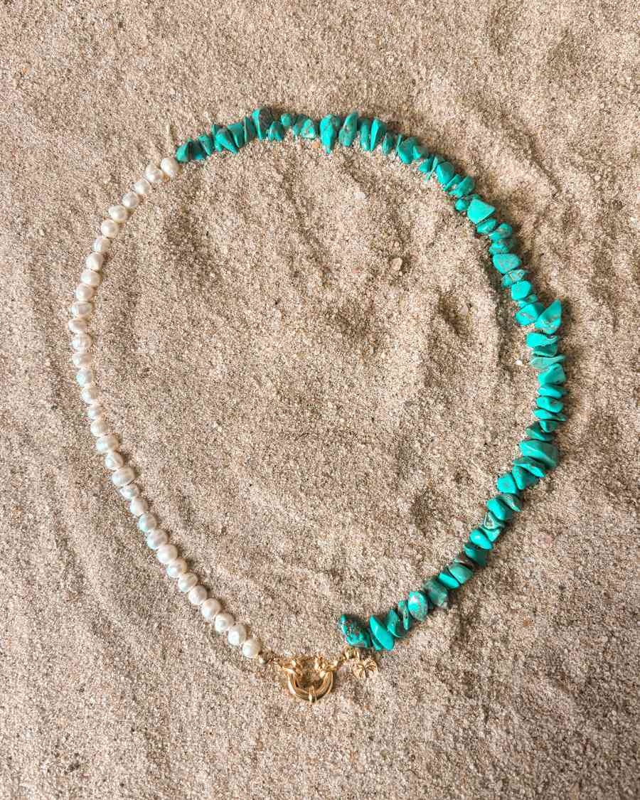 Heavy quality bead necklace made of turquoise natural stone chips and freshwater pearls.