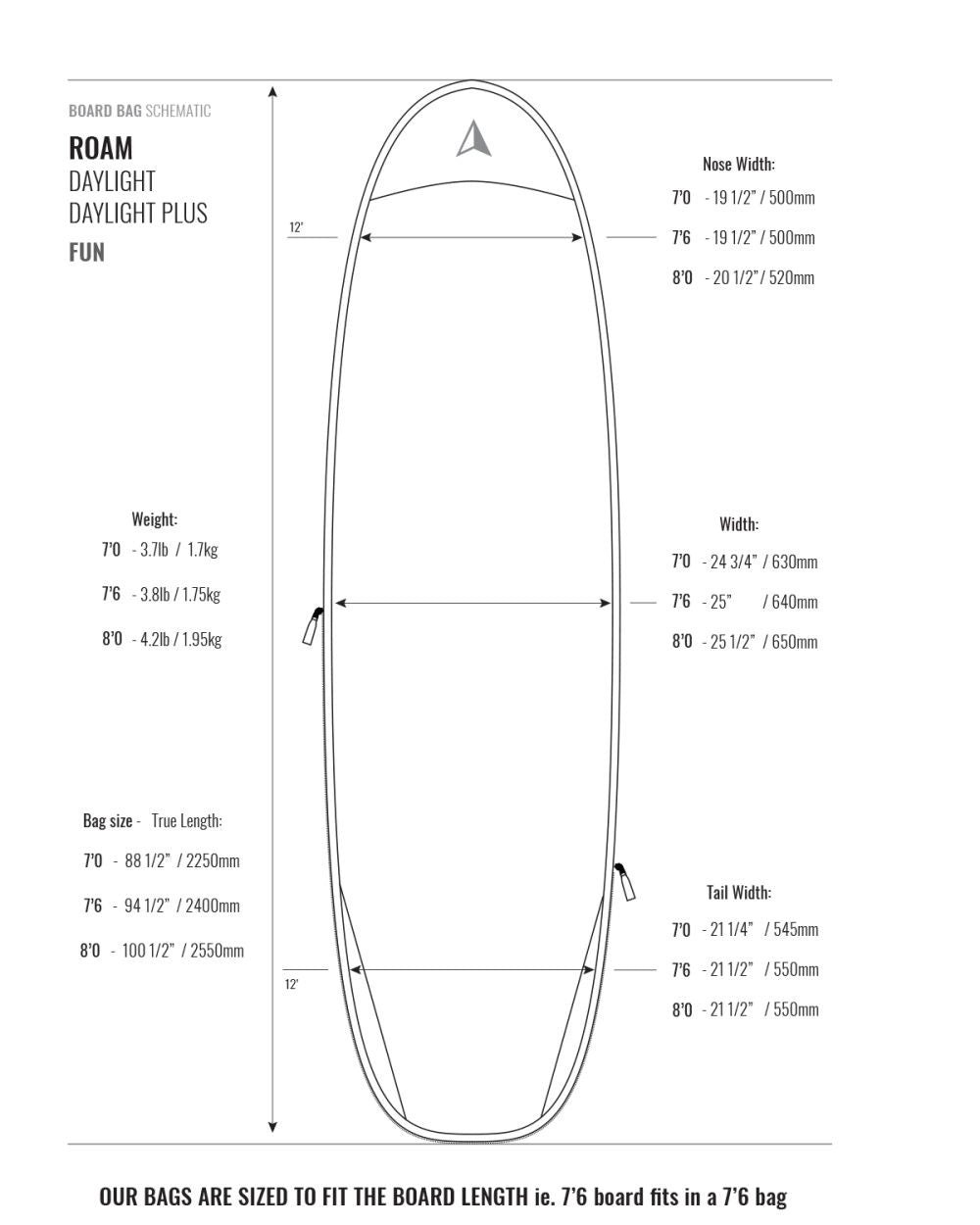 Our daylight features 5mm high density padding throughout, heat reflective material outside and wax resistant material inside. The handle is a generous padded carry handle and the strap is buckle free and removable for travelling. The zip is much longer than most other bags, extending up to the handle on one side, so removing waxy boards is easy. Tail darts enable boards to be stashed with or without fins. These are great bags for daily use or extra padding inside a coffin bag. Our bags are cut longer so a bag will fit the board that it is labelled for. ie a 6’8 bag will fit any size up to and including 6’8. The cut is slightly wider in the tail than our Tech bag do you can chuck in a wetsuit or put your board in a board sock for extra protection.