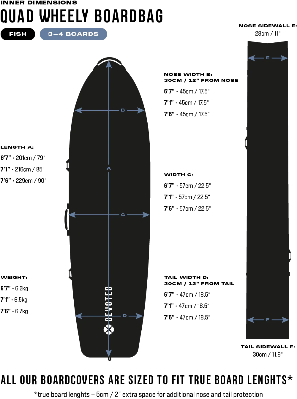Zorg voor optimale bescherming van je volledige quiver (tot wel 4 surfboards) tijdens reizen naar verschillende bestemmingen met de Devoted Travel Wheelie 10mm Quad Boardbag. Dankzij 10 mm foam padding met extra versteviging bij nose, tail en rails, in combinatie met duurzame DEVO-TECH materialen, zijn je boards rondom goed beschermd.