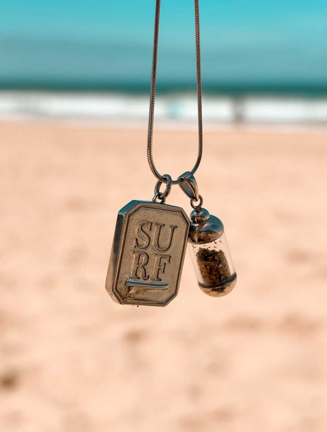 Deze Beach Pendant ketting met een surfend meisje draag je als een symbool van je passie voor surfen en je verbondenheid met de golven. Bewaar het zand van jouw surfspot in de Beach Pendant en draag je treasure altijd dicht bij je hart. De kleur van het zand maakt jouw treasure for life uniek!