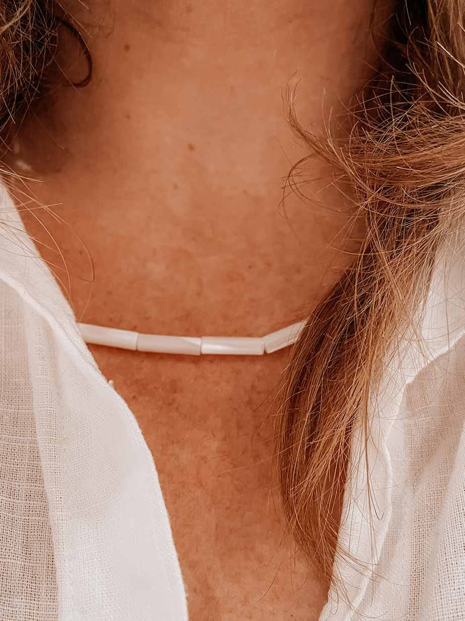 Maak jouw outfit compleet met deze stijlvolle kralenketting gemaakt van parelmoer kralen.