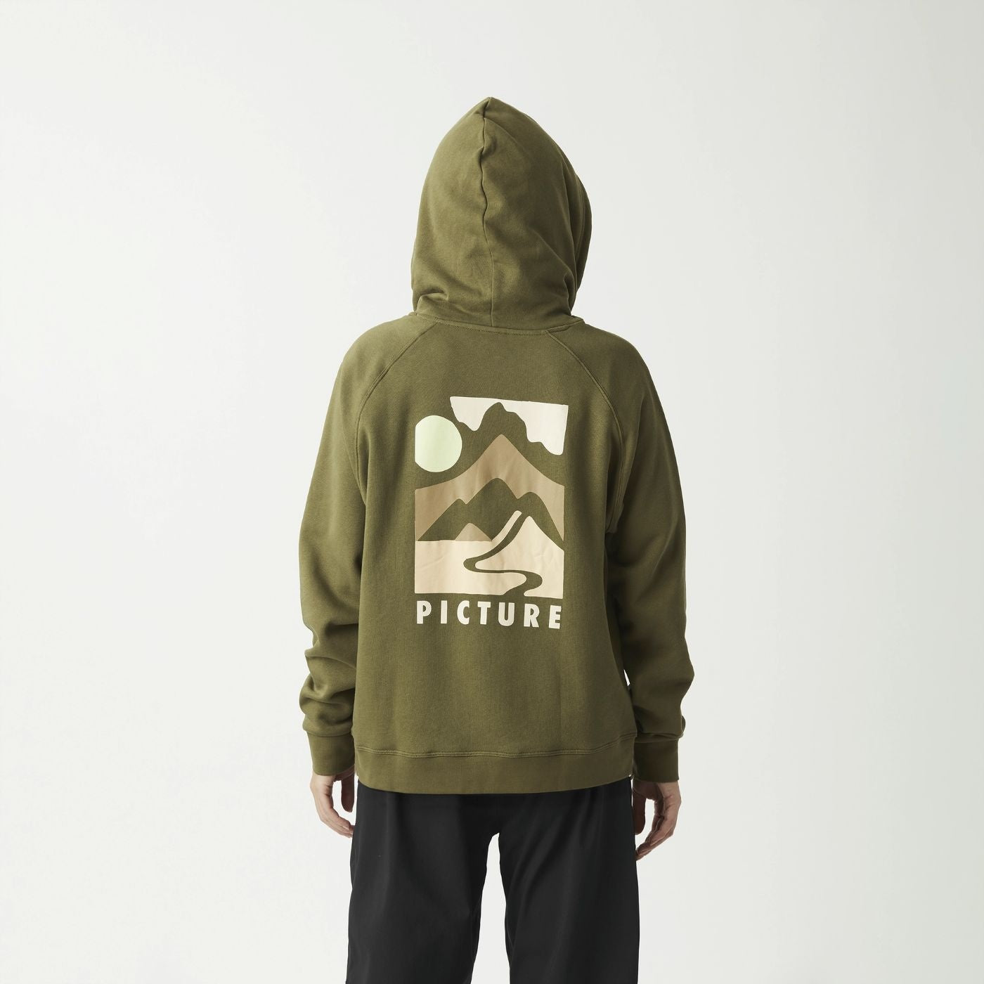 330g fleece hoodie with an outdoor print on the back, relaxed fit. Made from 100% organic cotton.