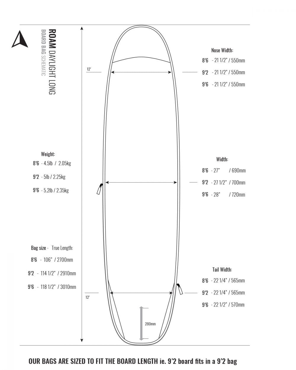 Onze boardbags zijn iets langer gesneden, zodat de tas altijd past bij de maat waarvoor hij bedoeld is. Een 6’8 boardbag past bijvoorbeeld voor alle boards tot en met 6’8. De tail is iets breder gesneden dan bij onze Tech boardbags, zodat je eenvoudig een wetsuit kunt meenemen of je board in een boardsock kunt plaatsen voor extra bescherming.
