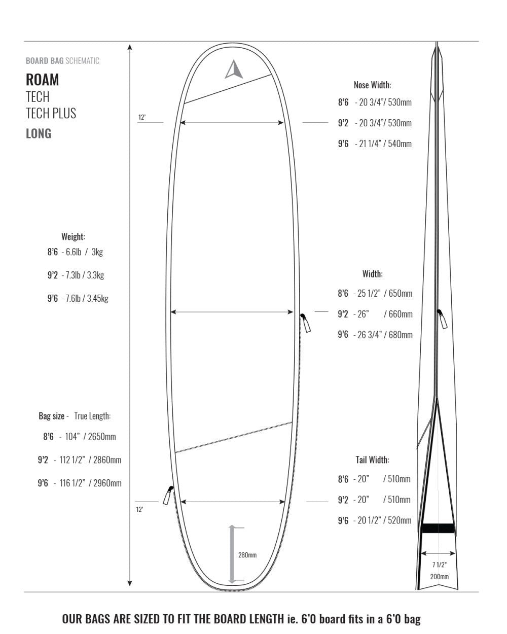 Dit is ons flagship product met alle premiumfuncties, kwaliteit en ontwerpdetails die we in al onze producten hebben ingebouwd. De Tech is een tas met veel functies en hoge specificaties. 10 mm vulling met hoge dichtheid en ripstop nylon zorgen voor maximale bescherming, terwijl de zilveren polytarp-zijde en ventilatie je boards koel houden. Het staartgedeelte kan worden uitgebreid om plaats te bieden aan boards met vinnen of kan plat worden opgevouwen voor op reis. De afneembare schouderriem zonder gesp heeft 3 bevestigingspunten, zodat u de balans van de tas kunt aanpassen als u een wetsuit in de zak van het wetsuit draagt. Dit is de beste tas voor iedereen die dagelijks op zoek is naar extra boardbescherming of voor een surfmissie als hij licht reist. Onze tassen zijn langer gesneden, zodat een tas past op het bord waarvoor deze is geëtiketteerd. Dat wil zeggen dat een tas van 1,80 meter past in elke maat tot en met 1,80 meter.
