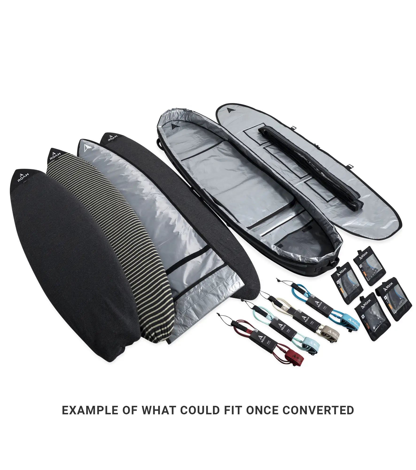 The Roam Converter Coffin is a super versatile board bag system. The base bag is a high end 2 board bag - 10mm padding, ripstop nylon, heavy duty zips and compression straps, makes this a legit travel bag on its own. For short haul, short trips the bag will hold your daily driver and step up or groveller, depending on location and forecast.